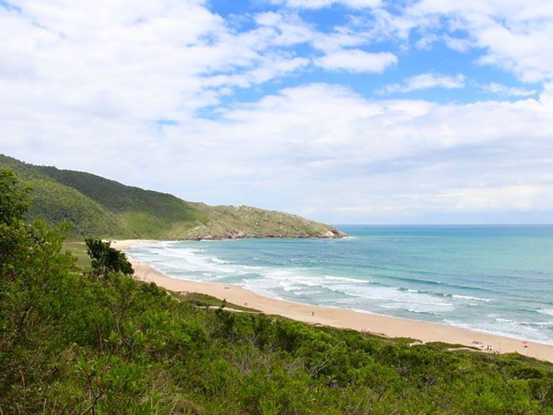 Com larga faixa de areias brancas e finas, ondas serenas, em alguns trechos, e agitadas em outro ao Norte, e propicia para o Surf. Suas águas são límipidas, porém são frias. Localizada a 22 km do centro de Florianópolis.